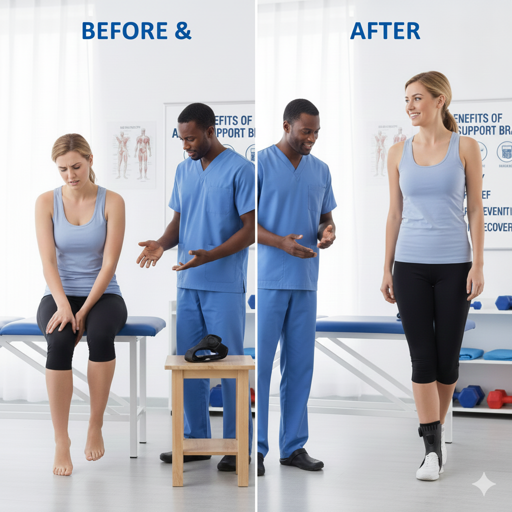 By maintaining proper alignment of the ankle joint, the orthosis reduces excessive inversion and eversion movements. This stabilization lowers the risk of sprains and contributes to safer gait mechanics in patients with neuromuscular weakness.